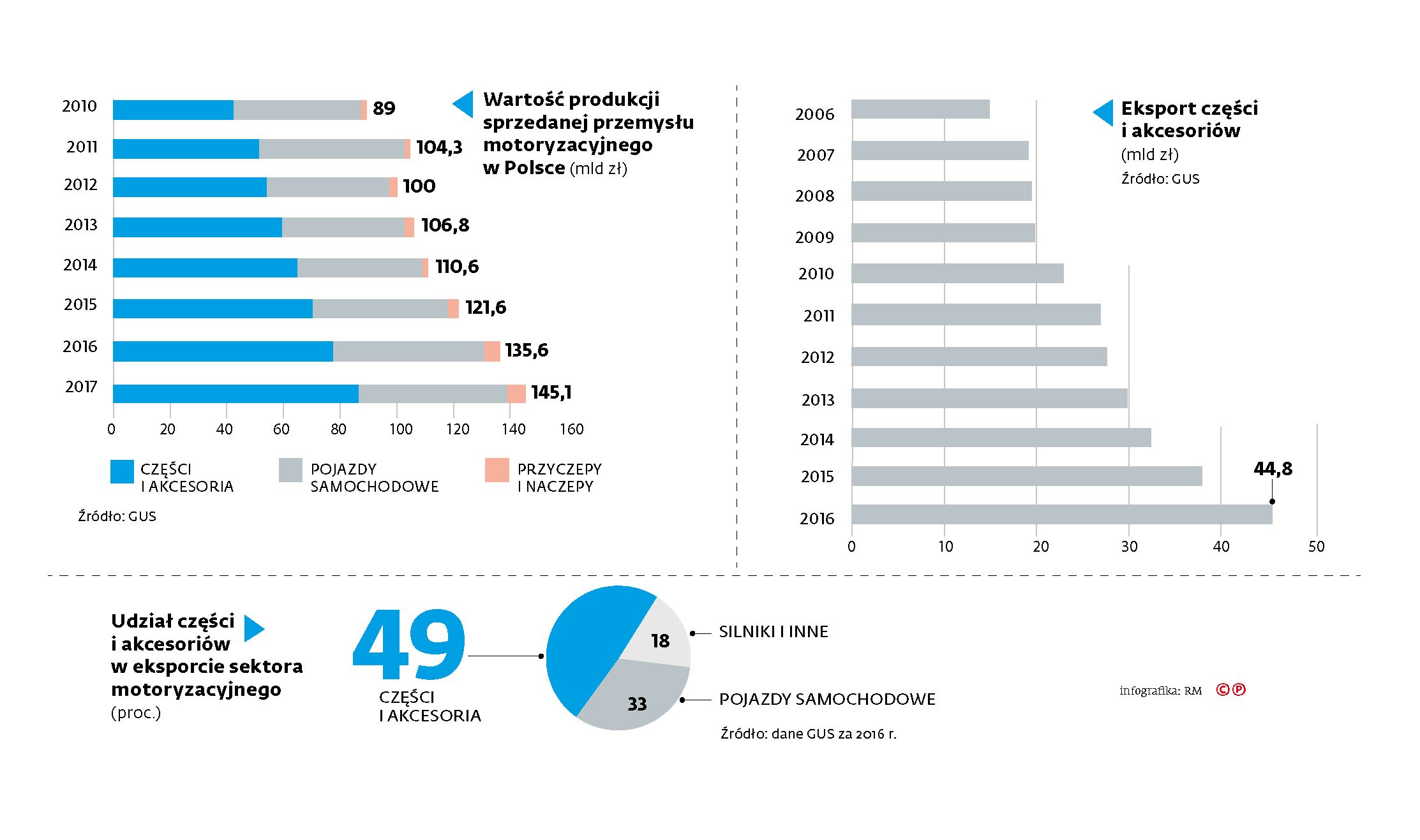 Części samochodowe stanowią poważną część produkcji motoryzacyjnej nad Wisłą. Ta część branży odpowiada za coraz większą część wartości sprzedanej sektora. Co równie ważne, części i akcesoria stanowią prawie połowę eksportu motoryzacyjnego w Polsce. Co więcej, wartość sprzedaży za granicę rośnie w tempie kilkunastu procent rocznie. W 2016 r. osiągnęła ona wartość 44,8 mld zł – o 19 proc. więcej niż rok wcześniej. Dzięki temu Polska zajmuje 10. miejsce na świecie wśród krajów eksportujących części motoryzacyjne. Znad Wisły wysyłane do innych krajów jest 3,2 proc. globalnego eksportu w tej kategorii. /